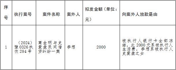 为进一步规范执行案款收发、管理,完善执行案款管理工作,维护当事人合法权益,防患廉政风险,现将河南省汝阳县人民法院拟向案外人发放的金额公示如下: