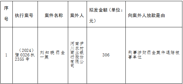 为进一步规范执行案款收发、管理,完善执行案款管理工作,维护当事人合法权益,防患廉政风险,现将河南省汝阳县人民法院拟向案外人发放的金额公示如下: