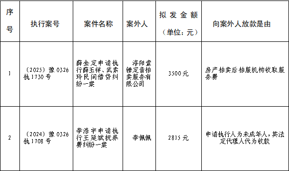 特别提示:公示期满3个自然日后,如无当事人提出异议,则该案款将向案外人发放,监督电话:0379-63157915。