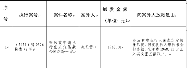 为进一步规范执行案款收发、管理,完善执行案款管理工作,维护当事人合法权益,防患廉政风险,现将河南省汝阳县人民法院拟向案外人发放的金额公示如下: