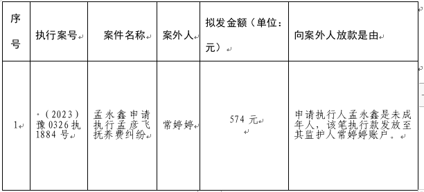 为进一步规范执行案款收发、管理,完善执行案款管理工作,维护当事人合法权益,防患廉政风险,现将河南省汝阳县人民法院拟向案外人发放的金额公示如下: