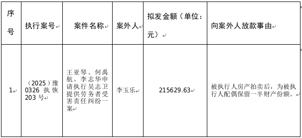 特别提示:公示期满3个自然日后,如无当事人提出异议,则该案款将向案外人发放,监督电话:0379-63157915。