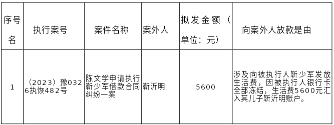 为进一步规范执行案款收发、管理,完善执行案款管理工作,维护当事人合法权益,防患廉政风险,现将河南省汝阳县人民法院拟向案外人发放的金额公示如下: 特别提示:公示期满3个自然日后,如无当事人提出异议,则该案款将向案外人发放,监督电话:0379-63157915。