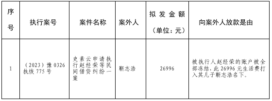 为进一步规范执行案款收发、管理,完善执行案款管理工作,维护当事人合法权益,防患廉政风险,现将河南省汝阳县人民法院拟向案外人发放的金额公示如下: