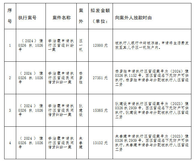为进一步规范执行案款收发、管理,完善执行案款管理工作,维护当事人合法权益,防患廉政风险,现将河南省汝阳县人民法院拟向案外人发放的金额公示如下: