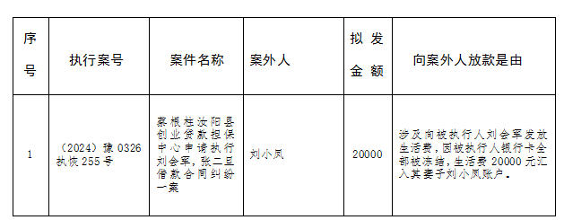 为进一步规范执行案款收发、管理,完善执行案款管理工作,维护当事人合法权益,防患廉政风险,现将河南省汝阳县人民法院拟向案外人发放的金额公示如下: