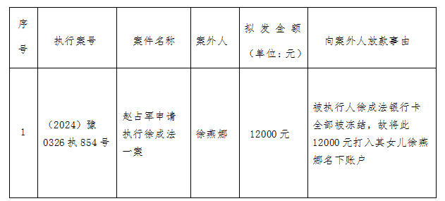 为进一步规范执行案款收发、管理,完善执行案款管理工作,维护当事人合法权益,防患廉政风险,现将河南省汝阳县人民法院拟向案外人发放的金额公示如下: