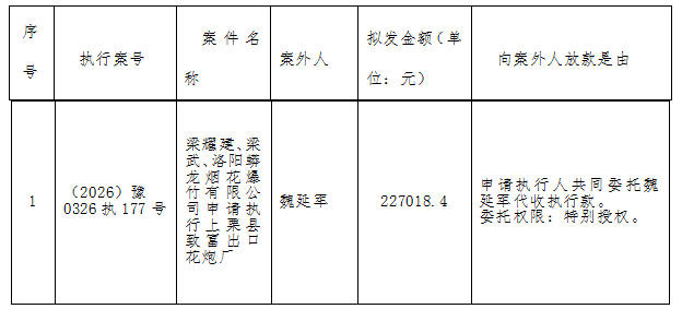 特别提示:公示期满3个自然日后,如无当事人提出异议,则该案款将向案外人发放,监督电话:0379-63157915。 河南省汝阳县人民法院执行局 2026年2月11日