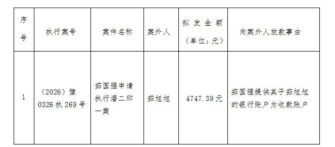 特别提示:公示期满3个自然日后,如无当事人提出异议,则该案款将向案外人发放,监督电话:0379-63157915。 河南省汝阳县人民法院执行局 2026年2月24日