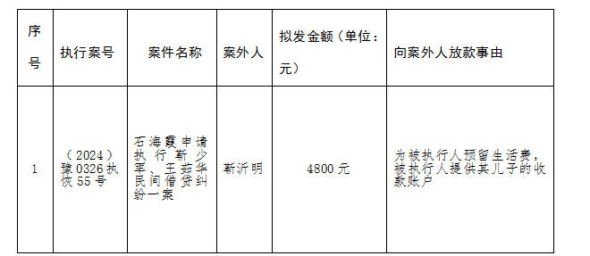为进一步规范执行案款收发、管理,完善执行案款管理工作,维护当事人合法权益,防患廉政风险,现将河南省汝阳县人民法院拟向案外人发放的金额公示如下: