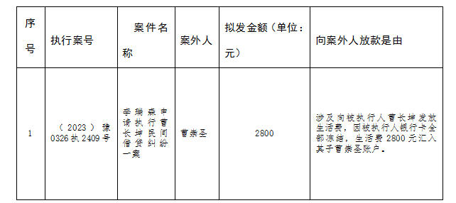 为进一步规范执行案款收发、管理,完善执行案款管理工作,维护当事人合法权益,防患廉政风险,现将河南省汝阳县人民法院拟向案外人发放的金额公示如下: