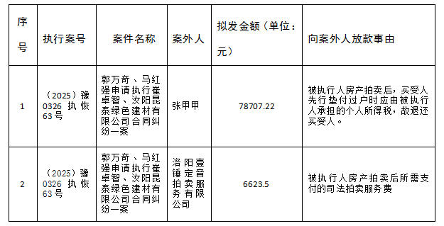 特别提示:公示期满3个自然日后,如无当事人提出异议,则该案款将向案外人发放,监督电话:0379-63157915。