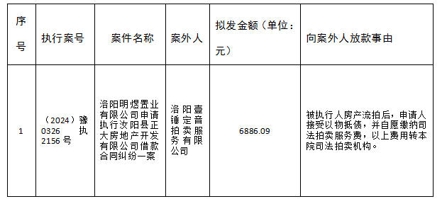特别提示:公示期满3个自然日后,如无当事人提出异议,则该案款将向案外人发放,监督电话:0379-63157915。