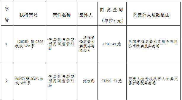 特别提示:公示期满3个自然日后,如无当事人提出异议,则该案款将向案外人发放,监督电话:0379-63157915。